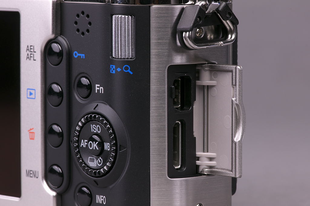 側面のハッチ内には,映像出力・USB接続兼用のマルチコネクタと,HDMIミニコネクタ。