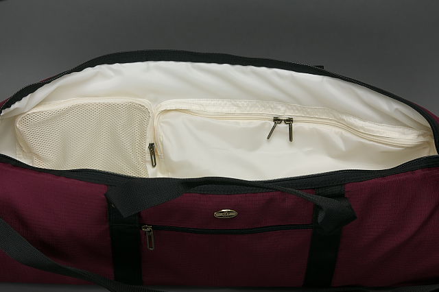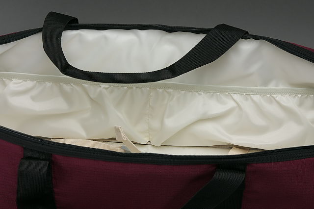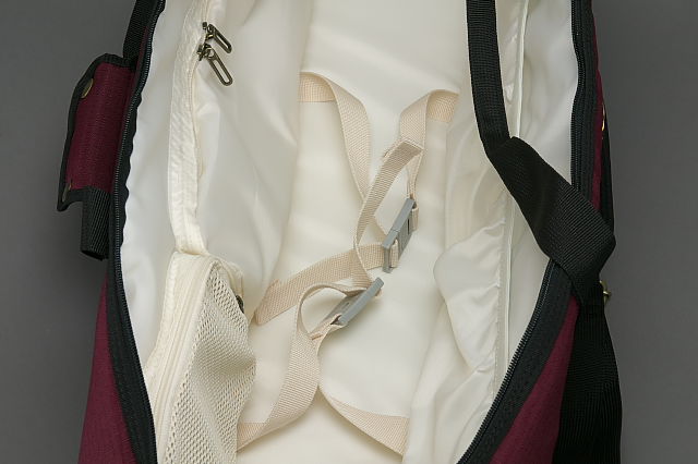 開口部がかなり大きく開きますし,内部のポケットも便利そう。固定用のストラップも中にあります。
