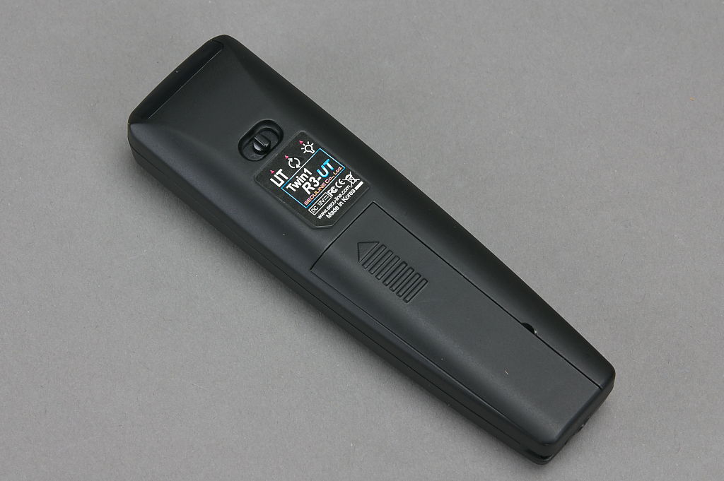 背面のスライドスイッチは,真ん中にすると今回付属の受光部用,左にするとD90などのカメラ本体に受光部のあるカメラ用に,右にすると先端に埋め込まれた白色LEDがライトになります。