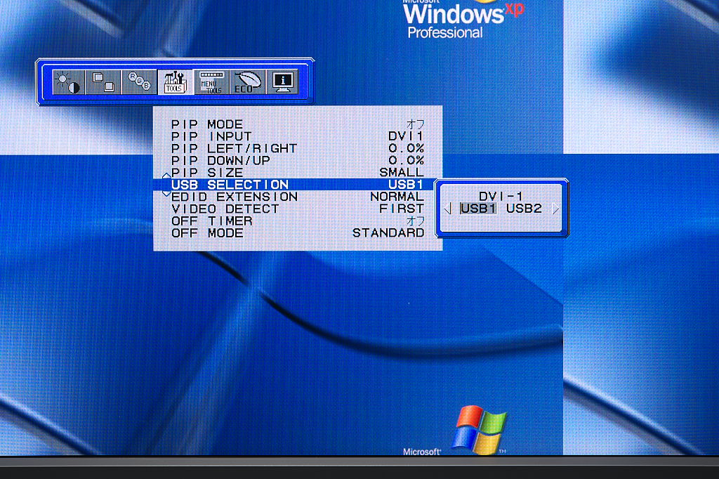 2系統の画面入力それぞれに別のUSBアップストリームポートを関連づけ,画面切り替えと連動してUSBも切り替えることが可能。