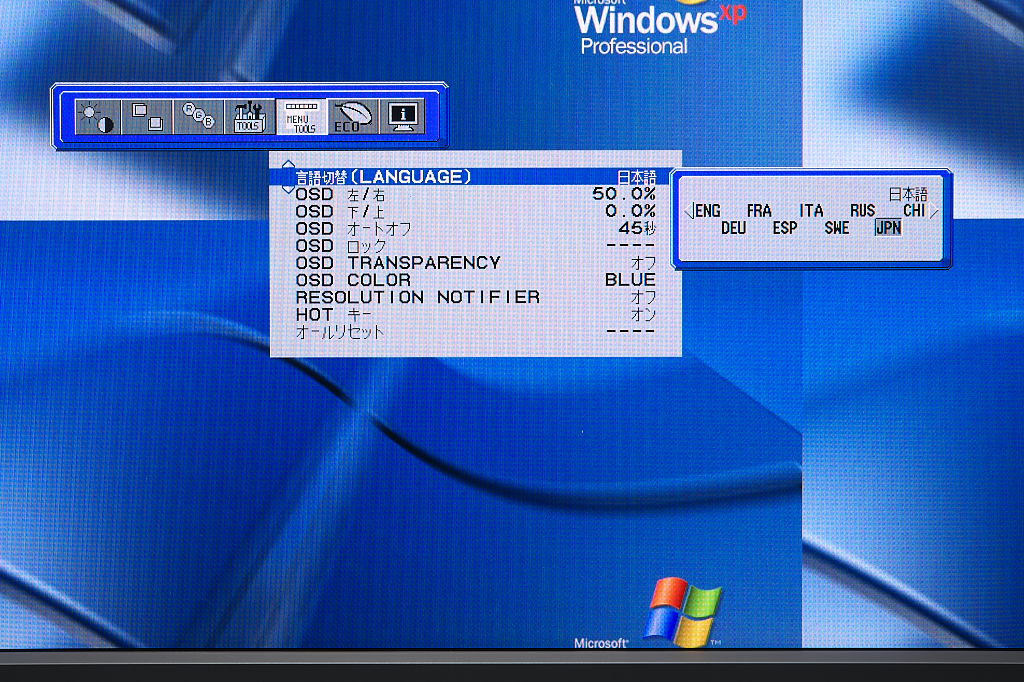 OSDメニューの表示言語,位置,オートオフ時間,色や透明度などを設定できます。