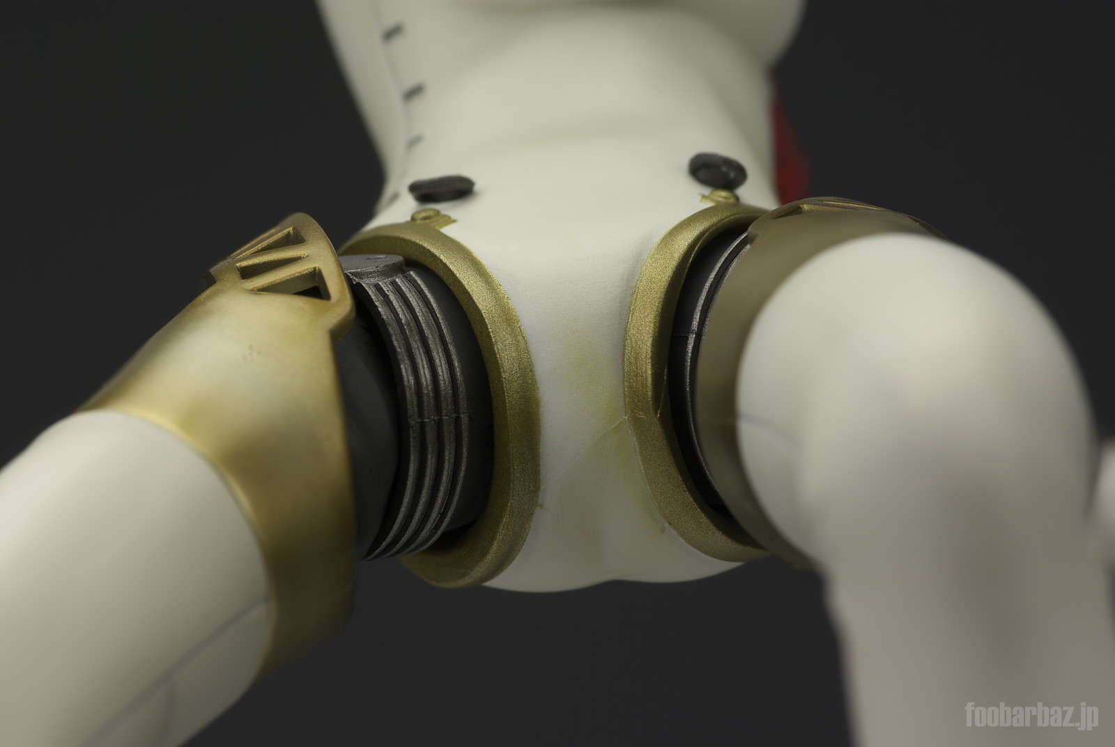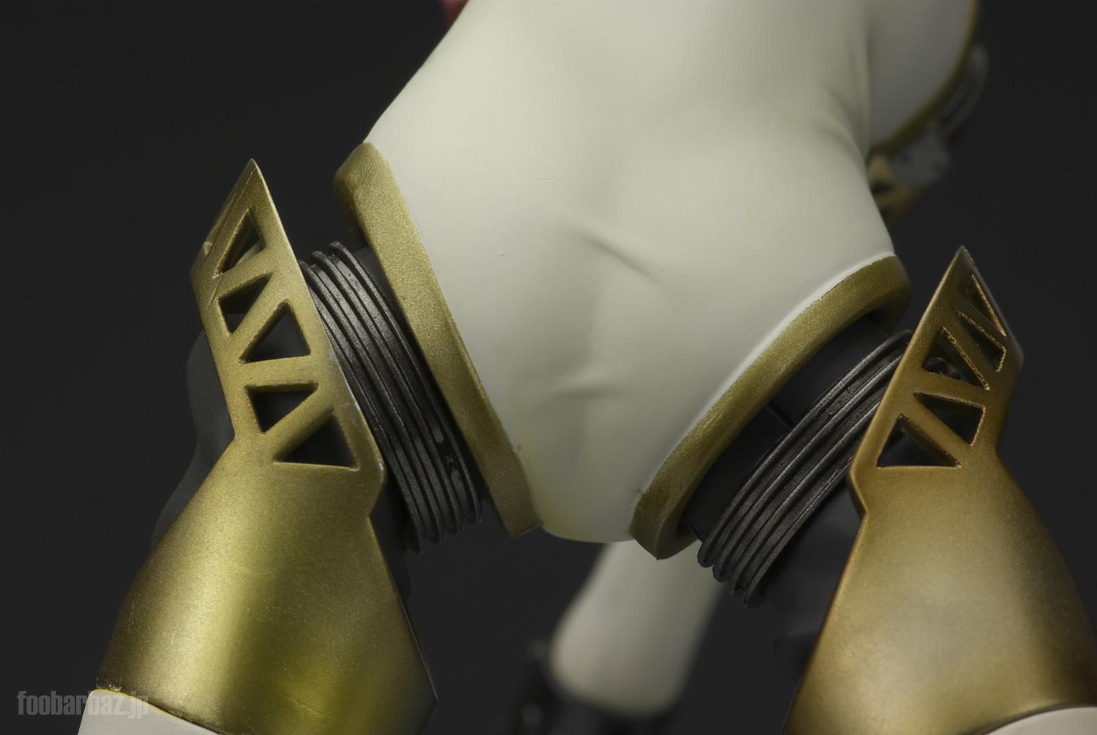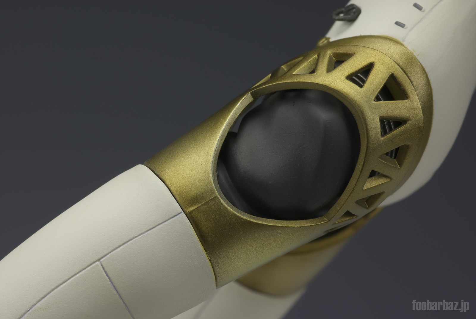 | 脚部の関節。クロームの可動リングに内部構造を包むゴム製と思われるカバー,それらを保護するトラス模様のガード。それぞれ質感を変えて塗装されています。 |
