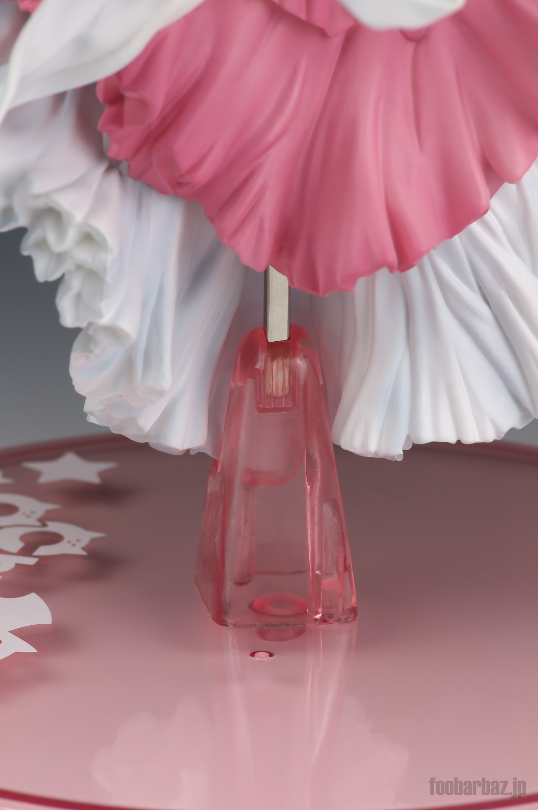 | 台座はロゴ入りのクリアピンク。 フィギュア本体とは金属棒でガッツリ固定されますが,台座側の受け口が壊れないかちょっと心配です。 | |