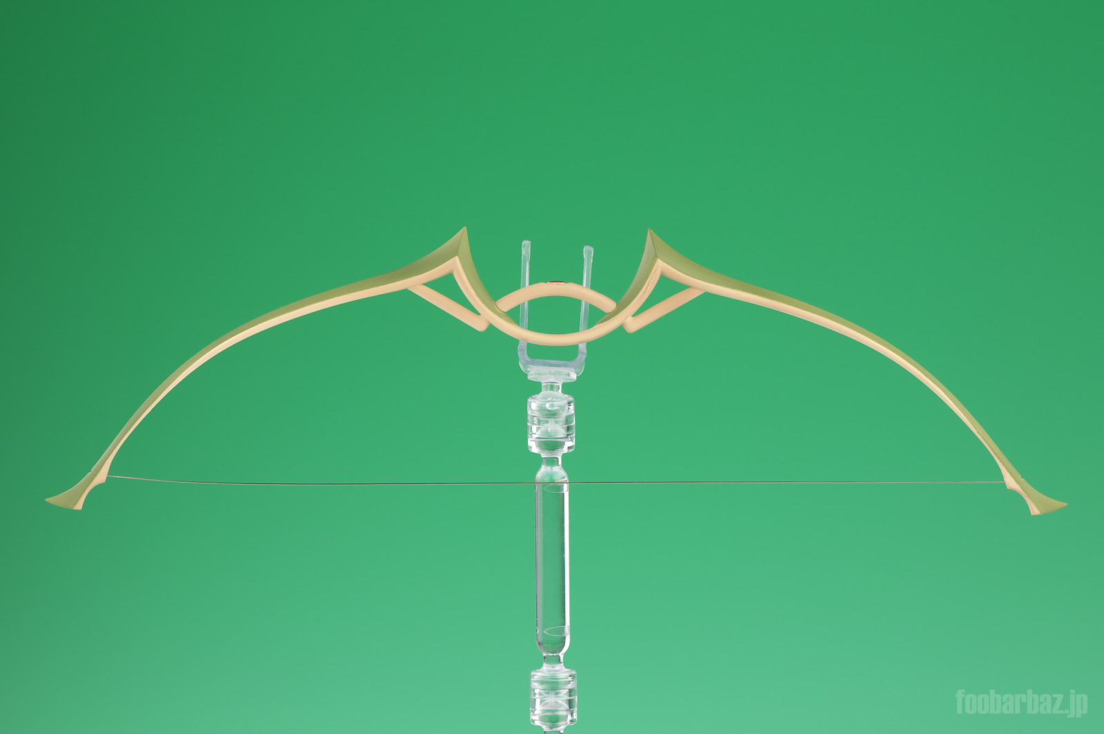 | 鋭いシェイプの弓。弦は鋼線が貼られています。 固定は手のひらに載せるだけですが,安定して持たせられます。 |