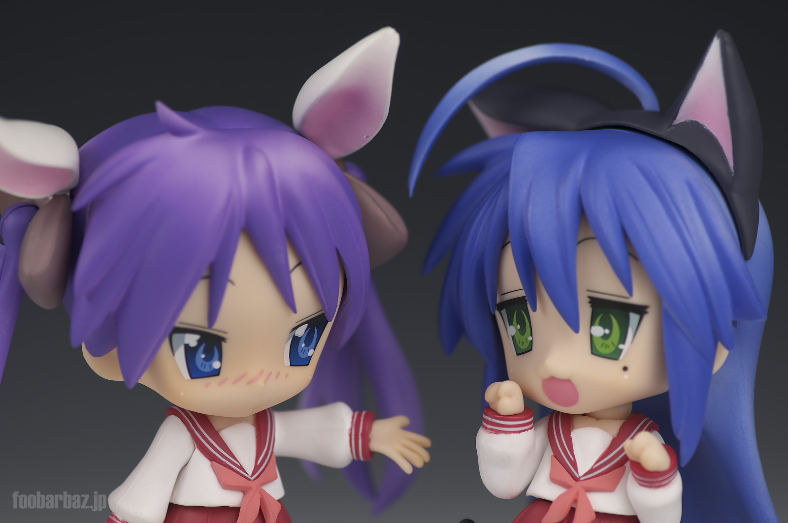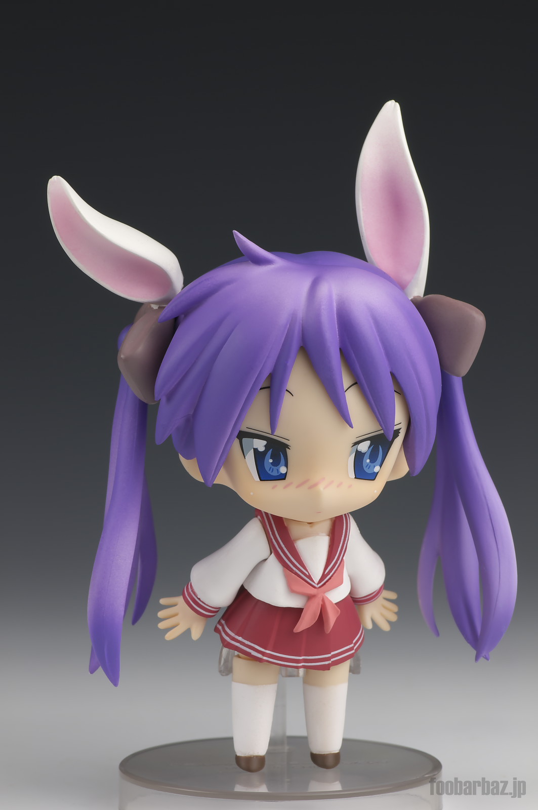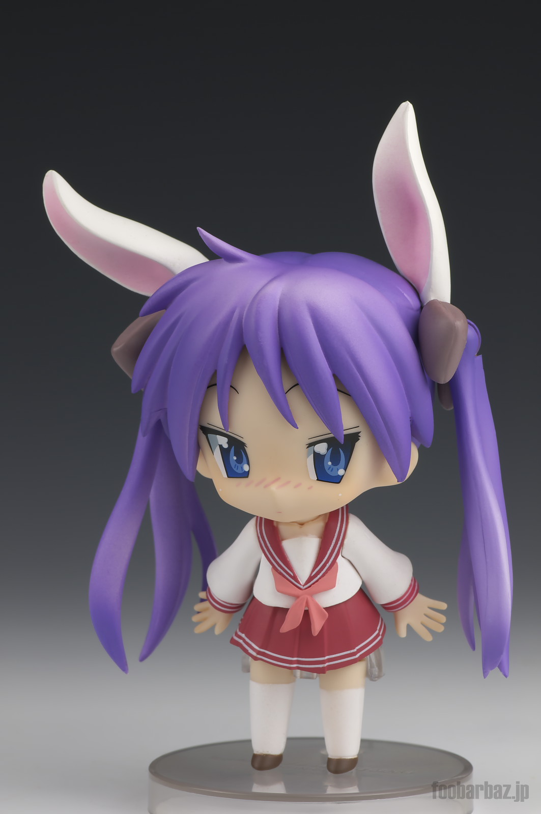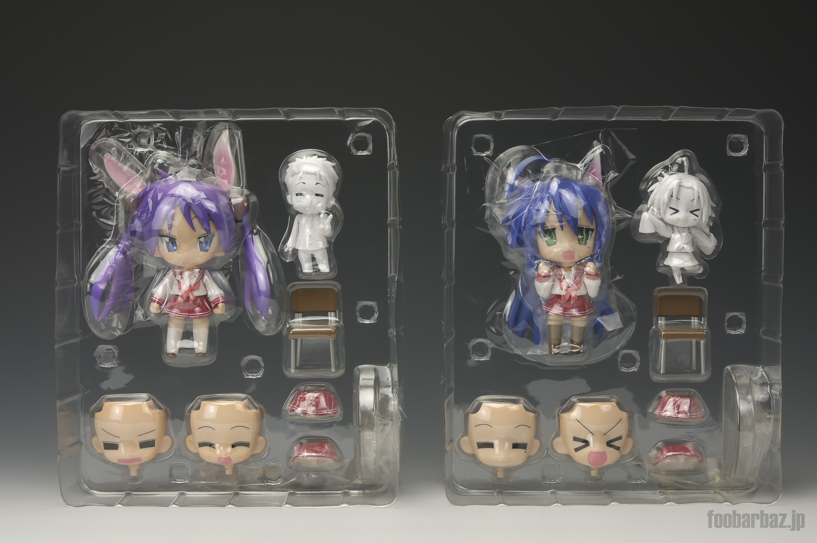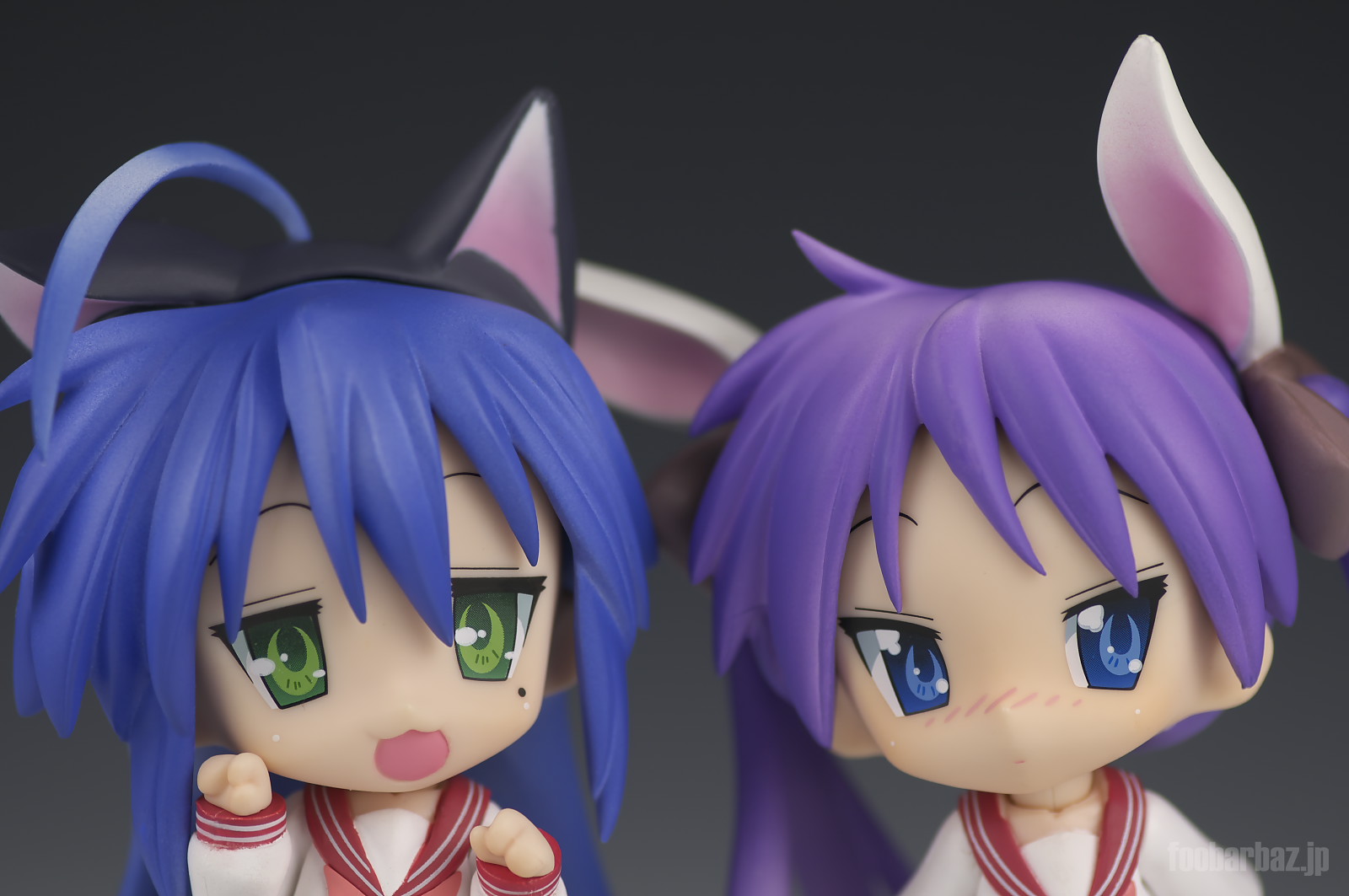 3種類のバージョンは共通パーツのほかにそれぞれ特有の顔とパーツが付属し,コンプVer.はこなたはねこみみしっぽの笑顔,かがみはうさみみしっぽのデレ顔が付属しています。