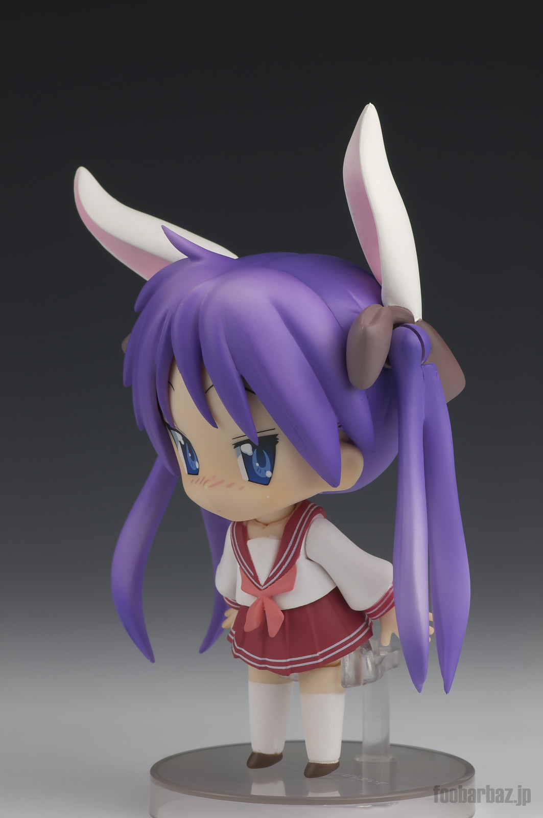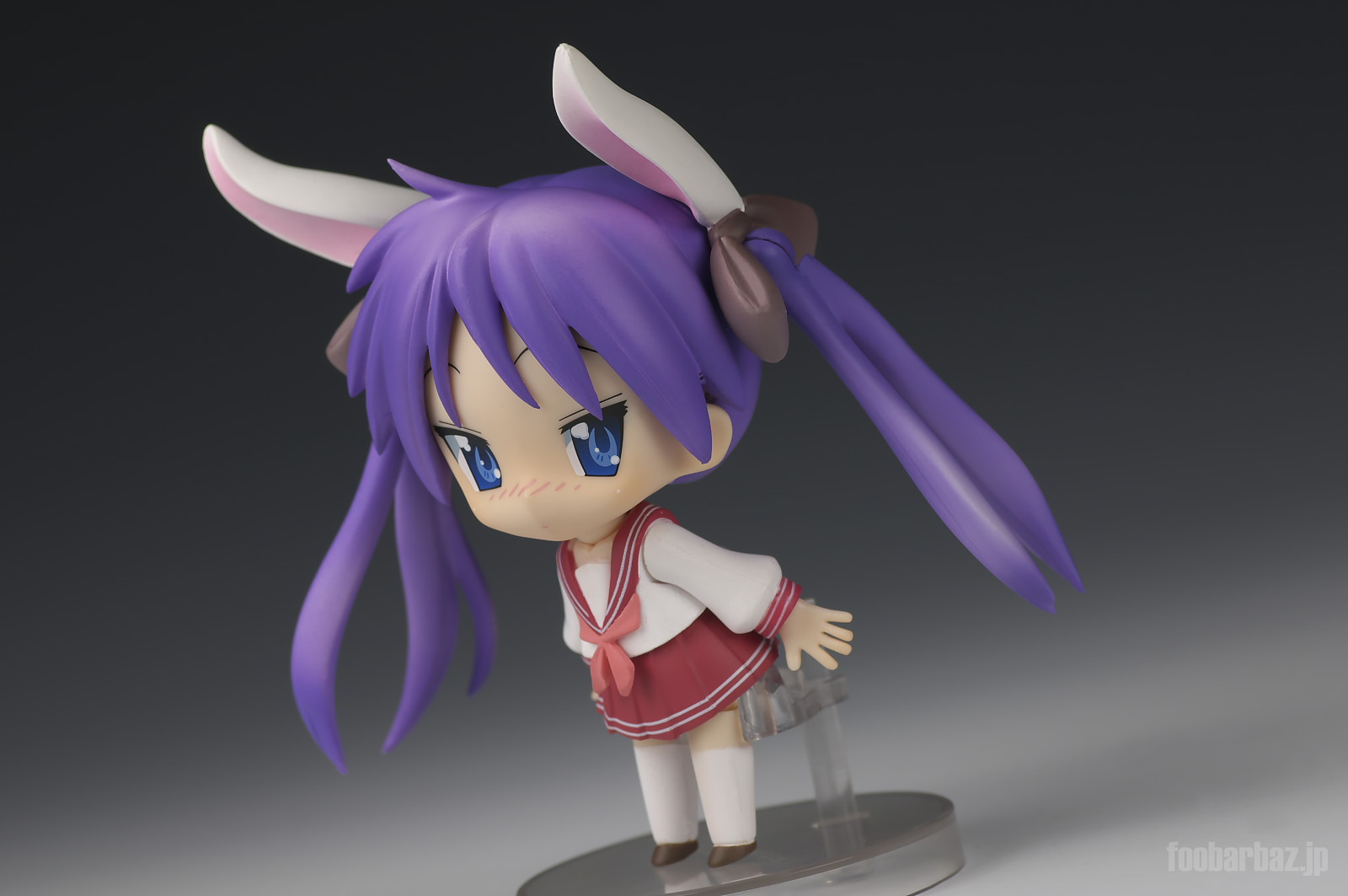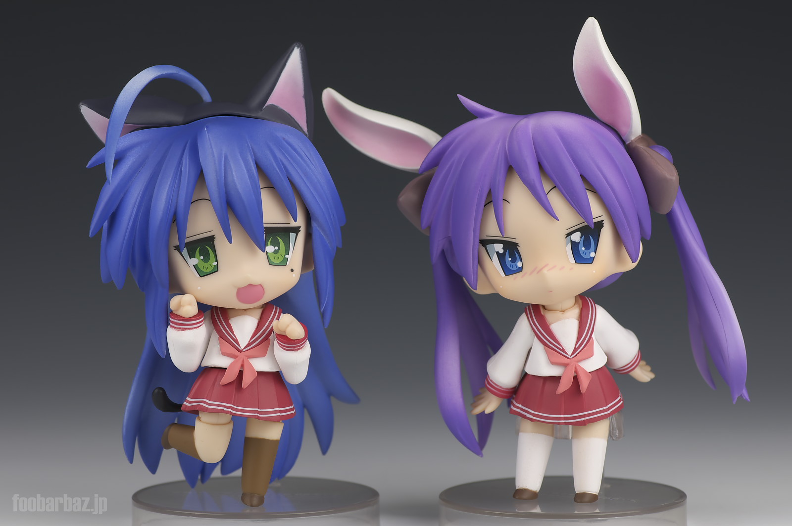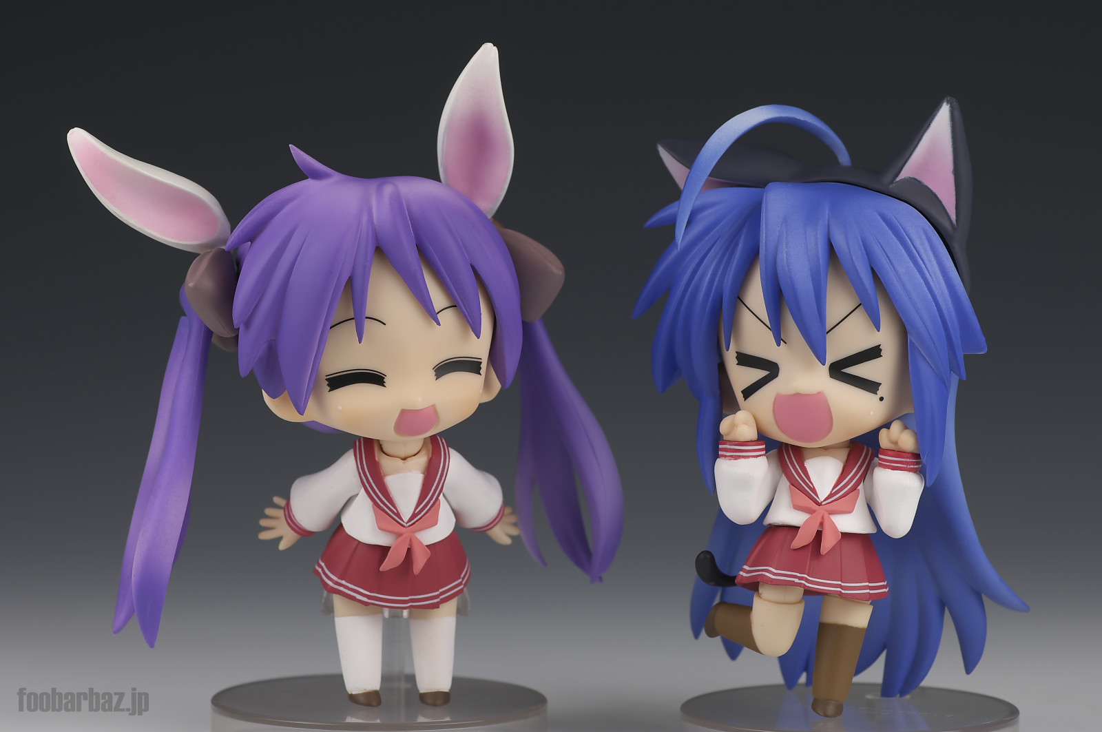 3種類のバージョンは共通パーツのほかにそれぞれ特有の顔とパーツが付属し,コンプVer.はこなたはねこみみしっぽの笑顔,かがみはうさみみしっぽのデレ顔が付属しています。