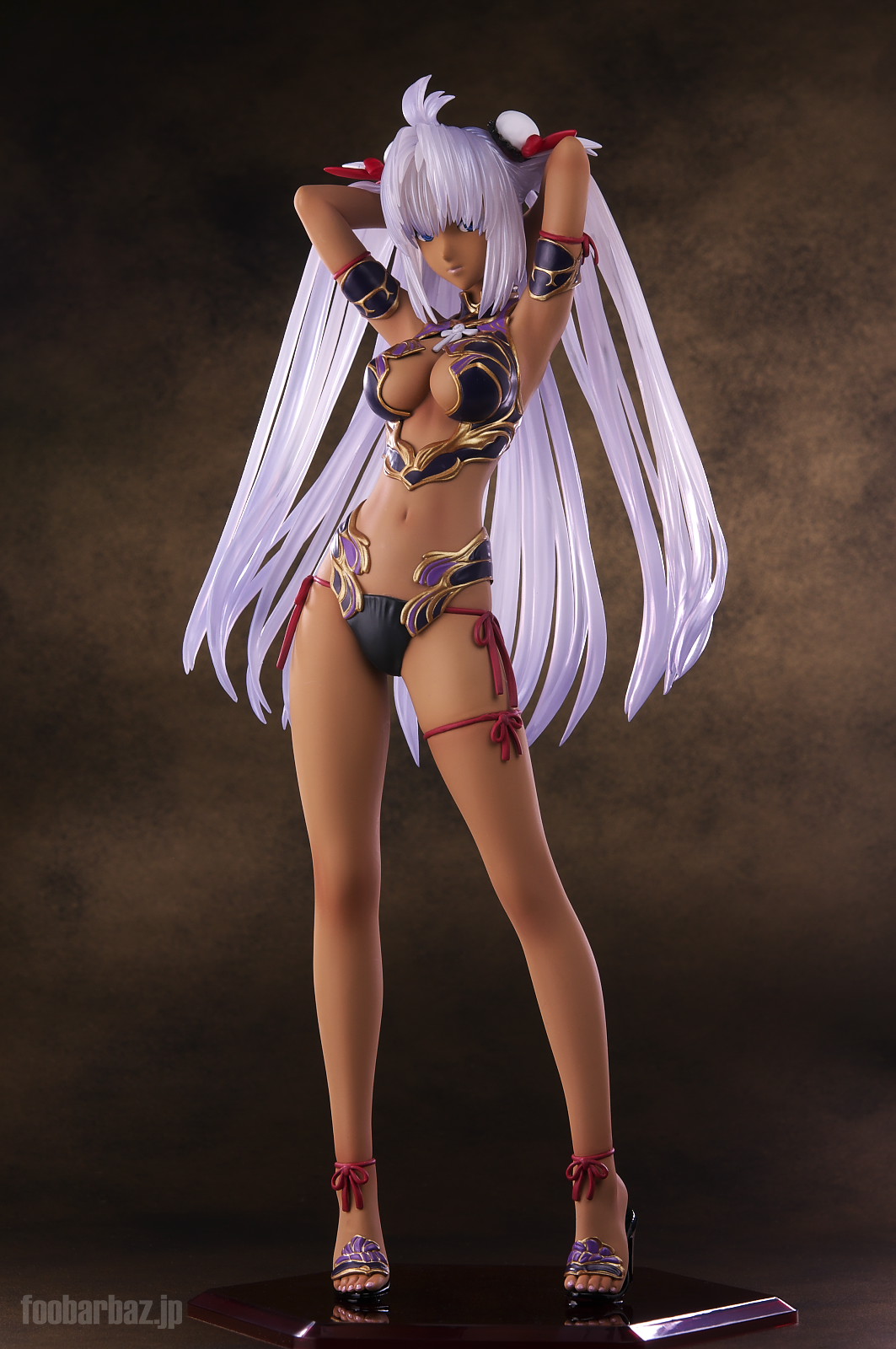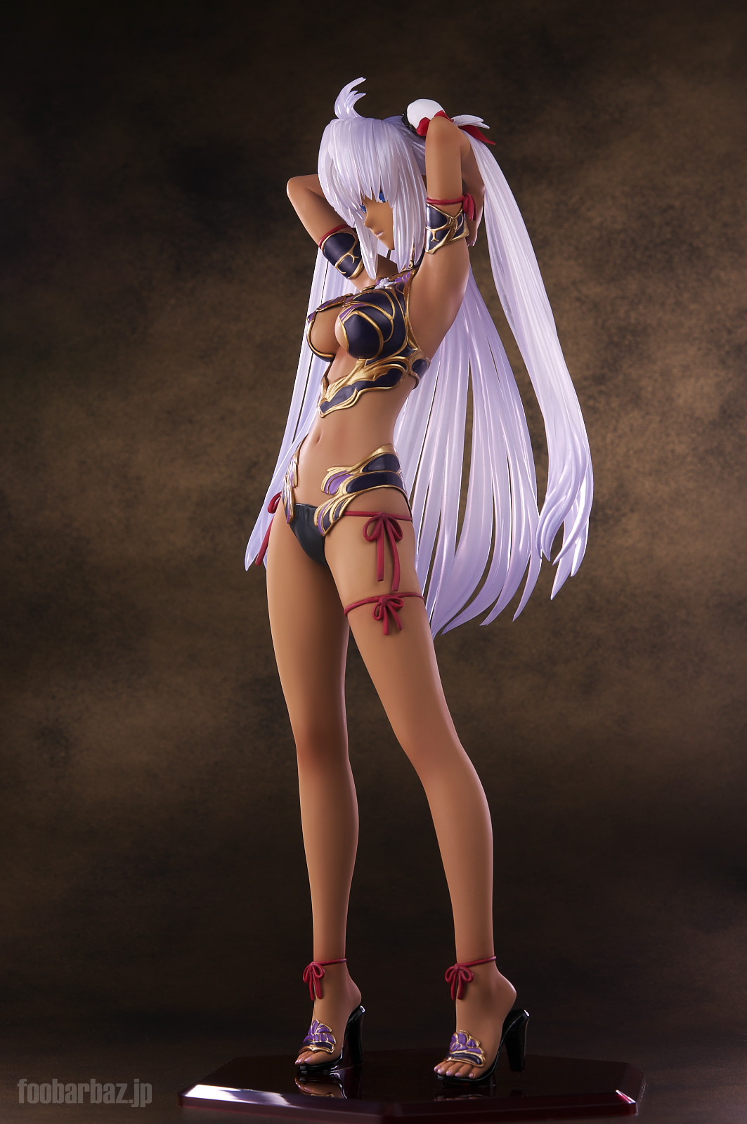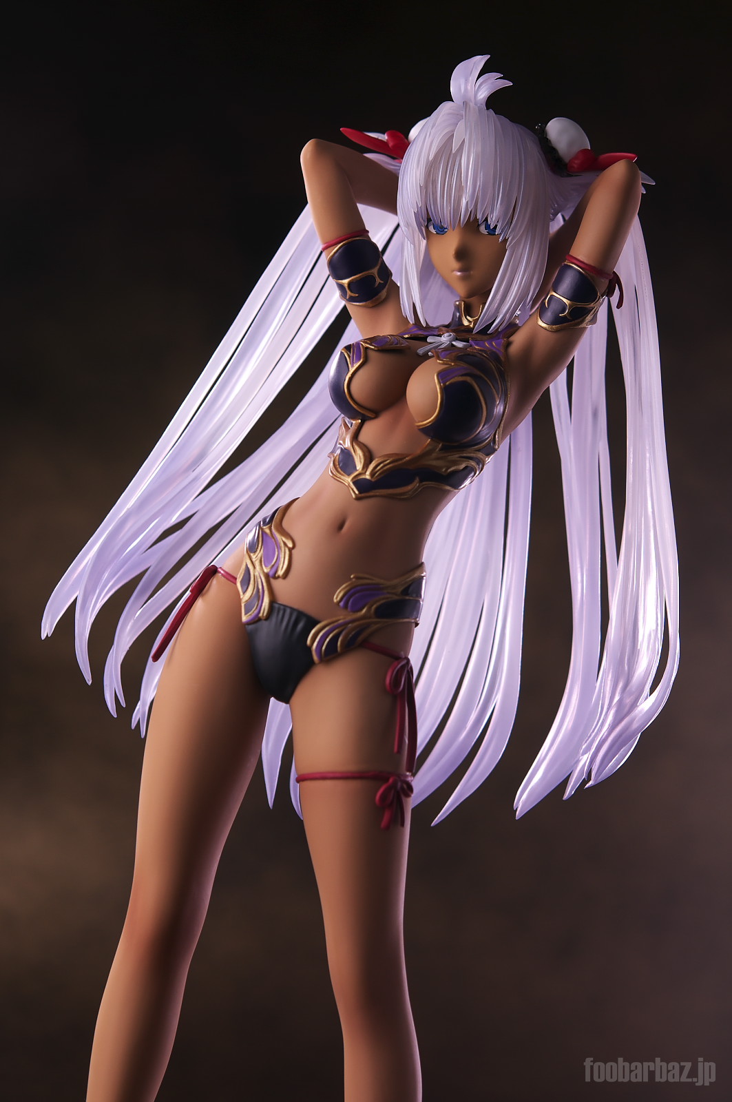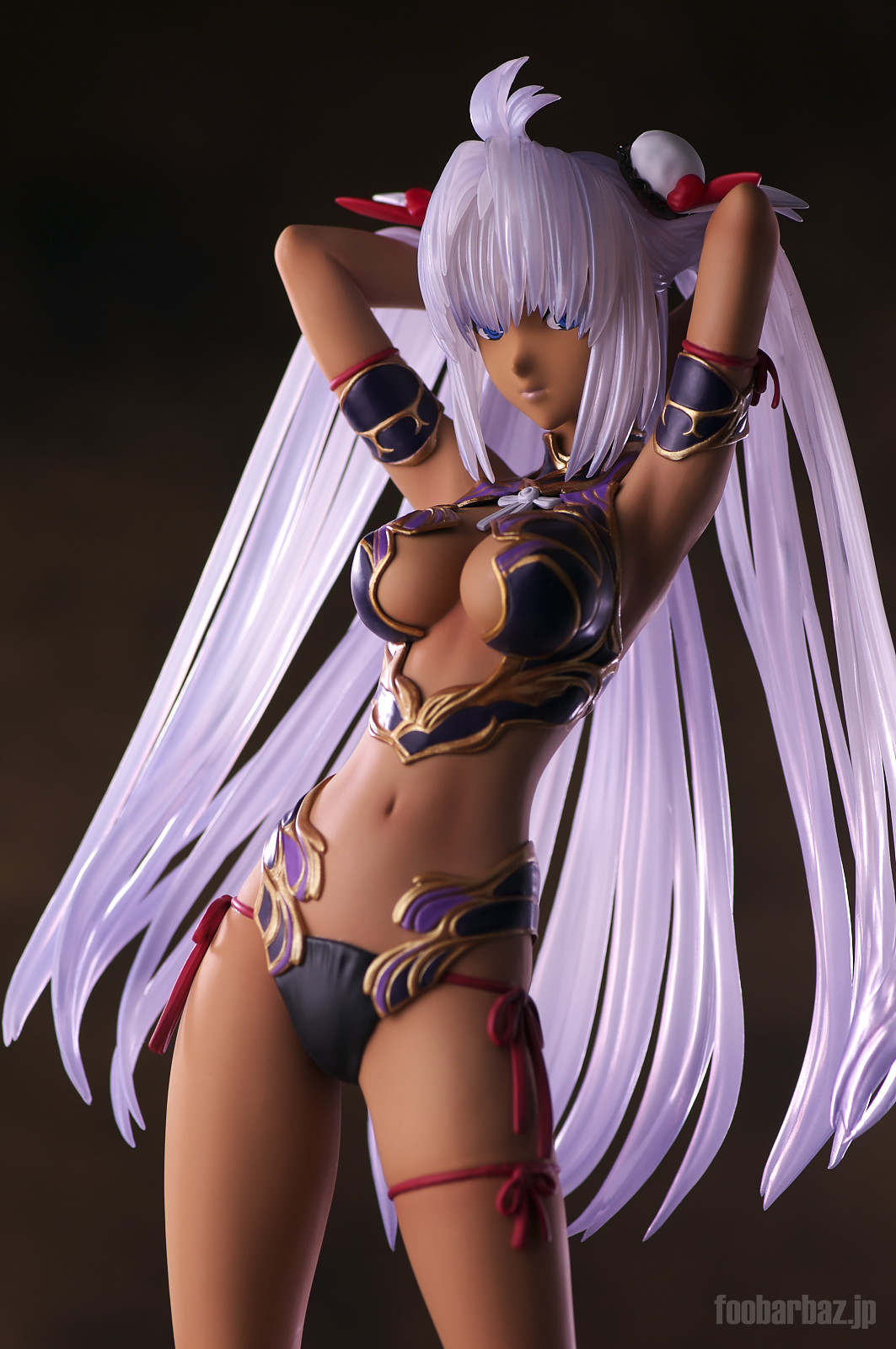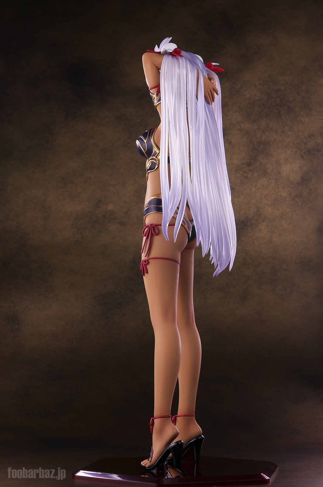 | ファンタジー世界の衣装のような(^^;水着。金の縁取りがゴージャスです。 塗装はやや荒く,飛び散りやムラが多め。 両手で掻き上げられた,ボリュームのある髪の毛はクリア素材。 光を透過して美しく輝きます。 | |