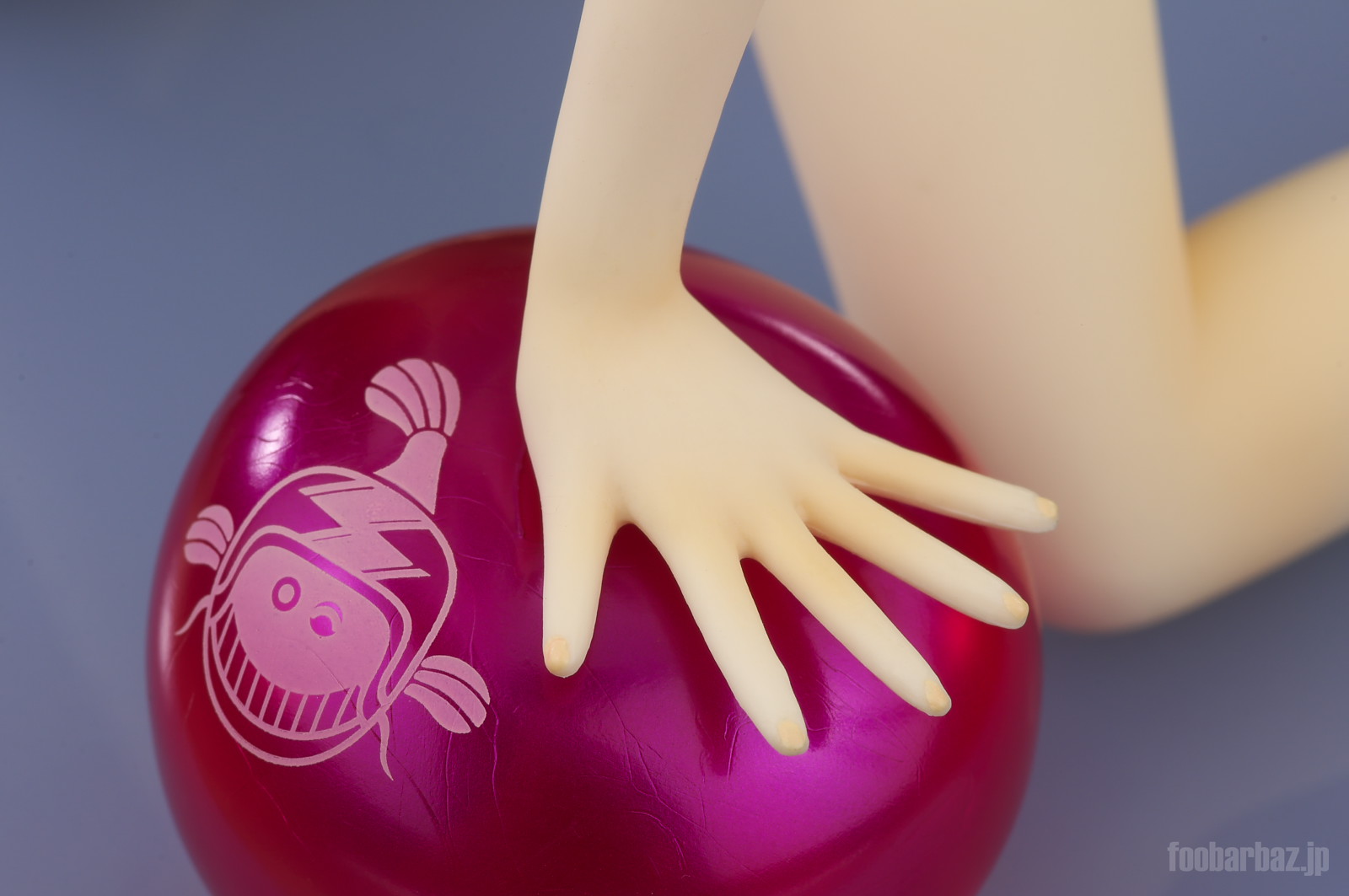 | 元気よく前を指さした右手と,ビーチボールに寄りかかった左手。 指先にはマニキュアまで施されています。 |