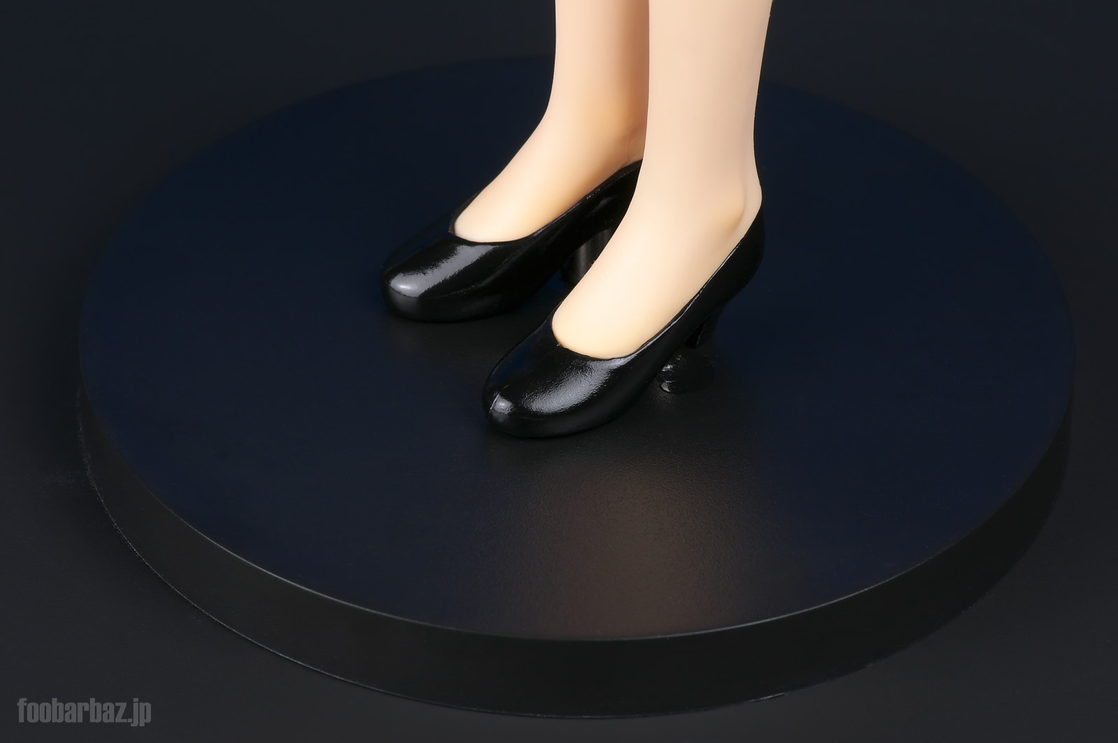 | 足元は黒のパンプス。 台座とは金属棒で固定されるのですが,この金属棒が斜めにしか刺さらず,しかも左足の方は長すぎて足が浮くという(^^; 仕方ないので台座の穴を削って差し込み,瞬間接着剤で固定してあります。 |
