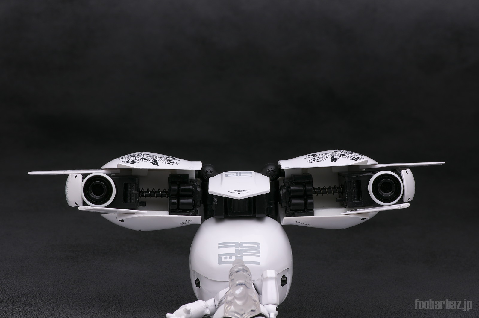 | なんと,ボタンを押すことで,スプリング仕込みのバーニアが飛び出します。 4枚のウイングも手動で展開可能。 |