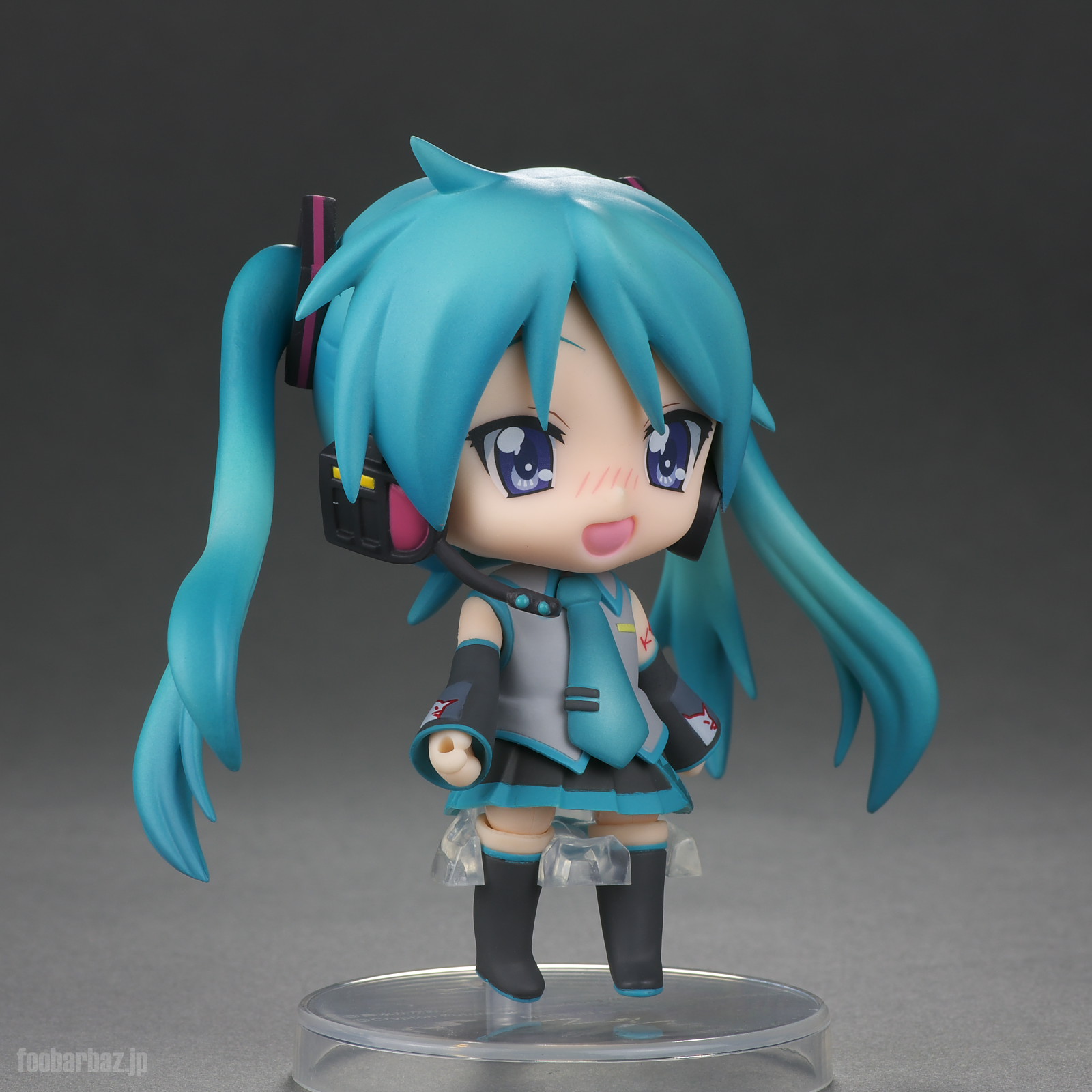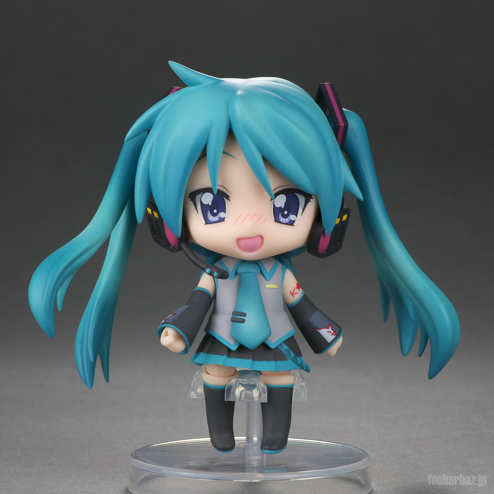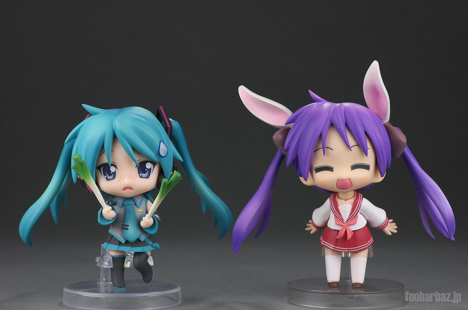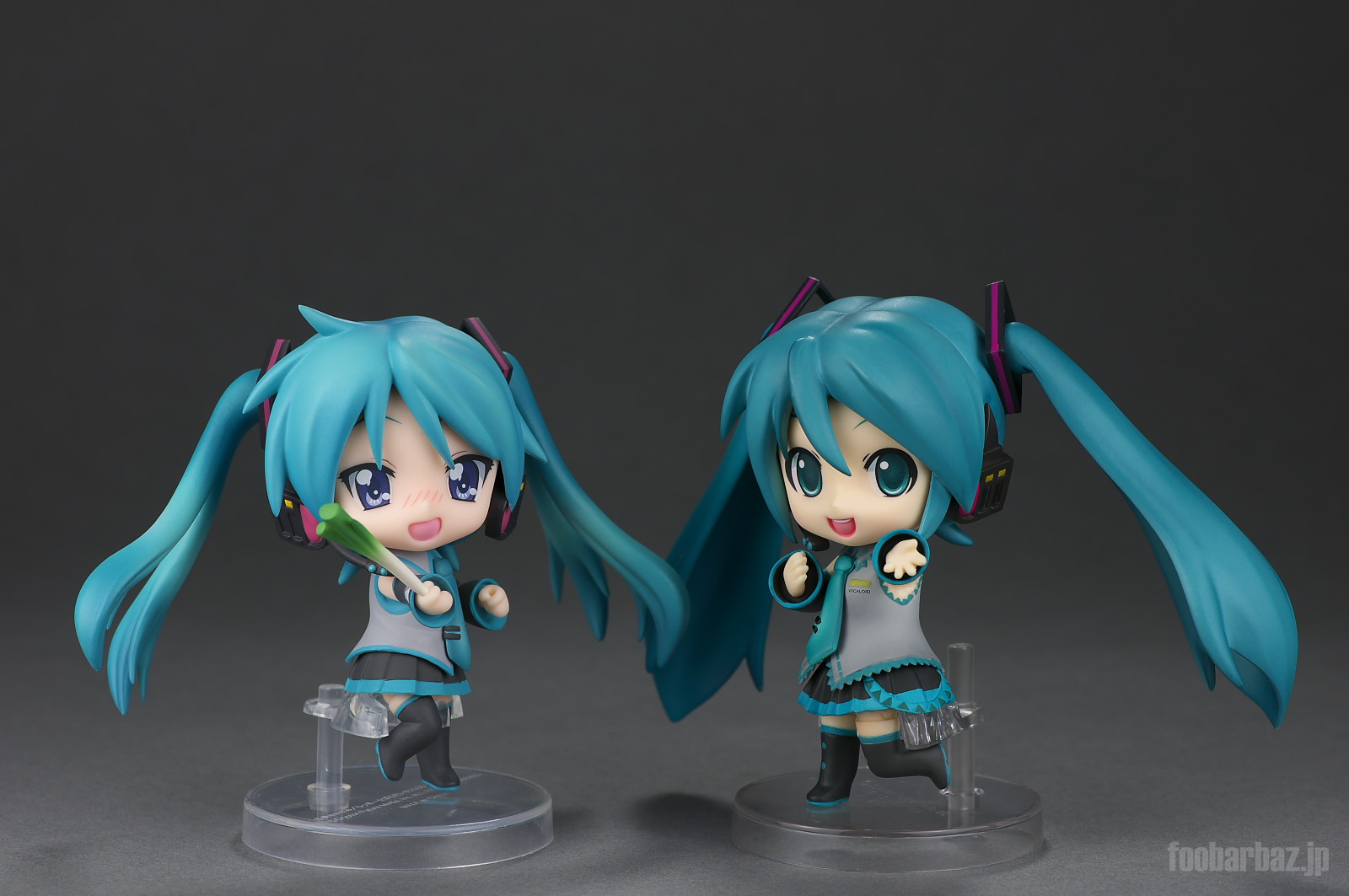 と並べて。どちらもかわゆいですな~(^^; 細部造形や色合いはだいぶ異なりますね。 特にお顔の色は,かがミクのほうがだいぶ色白です。 |