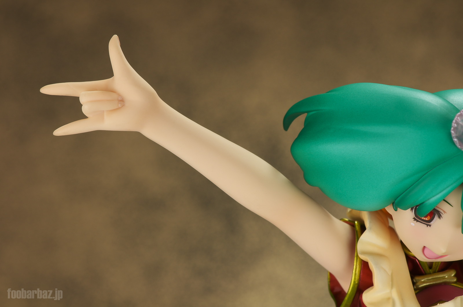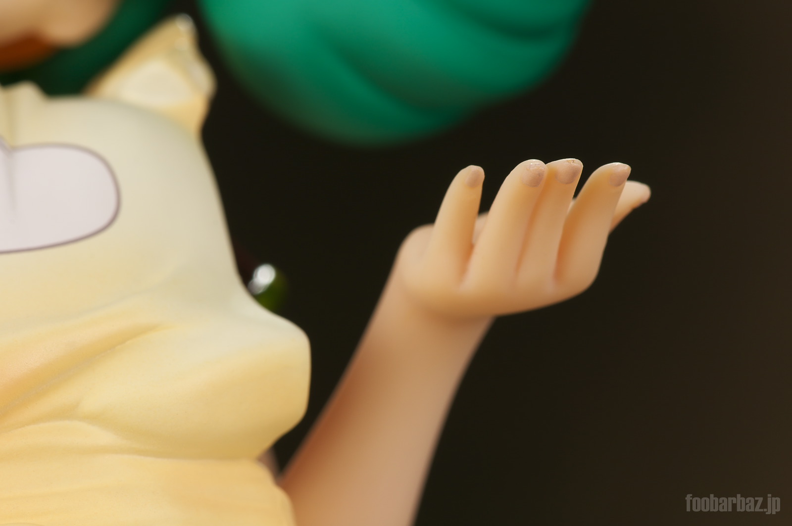 | ピンと伸ばした右手はおなじみのあのポーズ(^^; 両手の指先には爪造形とマニキュアが。 なお,お盆はダボなどはなく,単に載せるだけ。 実際飾るときはワックスなどで固定するといいかも。 |