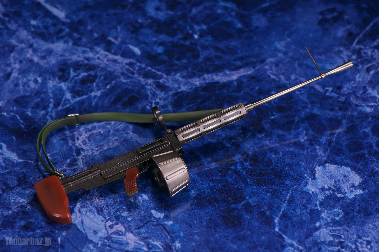 | 両手で掲げた巨大な機関銃。細やかな造形と塗装でめっさリアル。 特に先端部は細いので,へし折らないよう注意が必要です。 照準器は寝かせることも可能。 |
