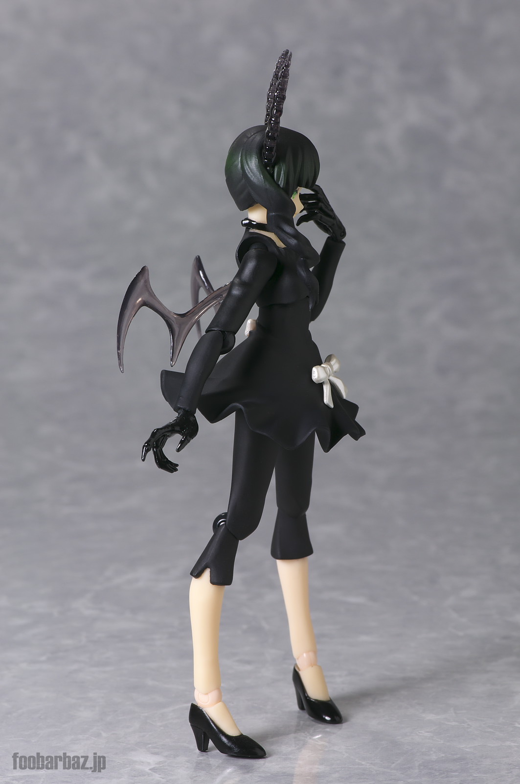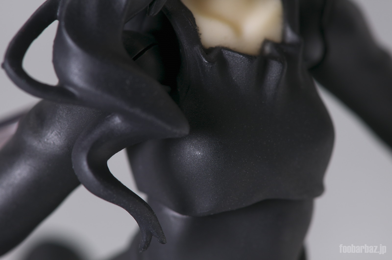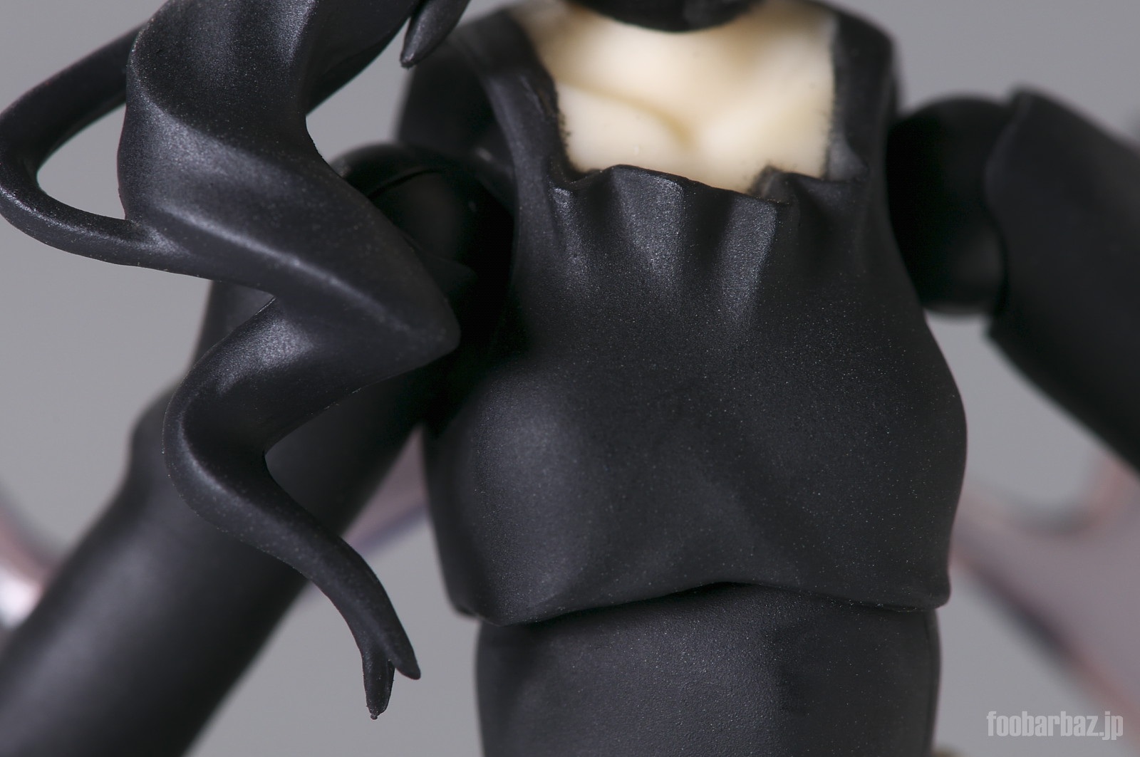 | 黒一色のお召し物。さすがに濃色ばかりなので,アップだと飛び散りが目立ちます。 背中の羽も,角同様のクリア素材。 スタンドとの結合部はおしりに開いています。 | |